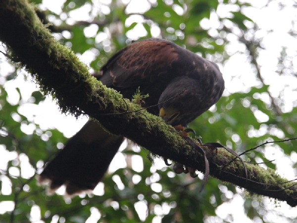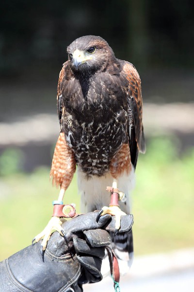 All four baby Harris hawks are now flying free and are exploring the woods around Ashford Castle. We are being very relaxed with their training at the moment so some days they are good and some days they are not so good. The two females have had a couple of trips out and about to start their hunting education, as you can see from this photo - they are easily distracted because everything is new and exciting, even a stalk of grass! There is an interesting photo of Joyce's tail in their Gallery (New Baby Hawks Gallery) - there is something unusual about her tail, any guesses as to what it might be.